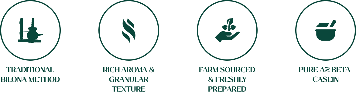 Our ghee begins with contented, free-grazing indigenous cows nourished on natural pasture and milked only after the calf is fed — honouring life, purity and balance. Made traditionally in iron kadhais over firewood and sun-dried cow-dung cake, it is slow-crafted from naturally cultured curd, hand-churned to fresh white butter and gently clarified to perfection.