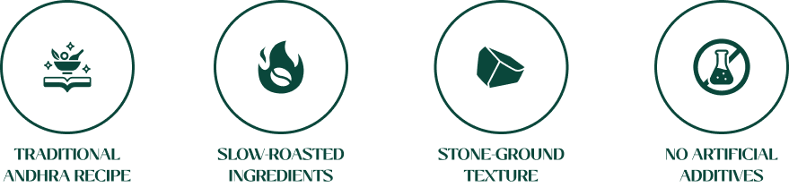 This traditional Andhra-style karam podi supports digestion and boosts metabolism through its warming spices and roasted lentils. Naturally rich in plant protein, minerals and antioxidants, it enhances appetite, fuels energy, and delivers balanced heat without overpowering the palate. A clean, preservative-free condiment suitable for daily use.